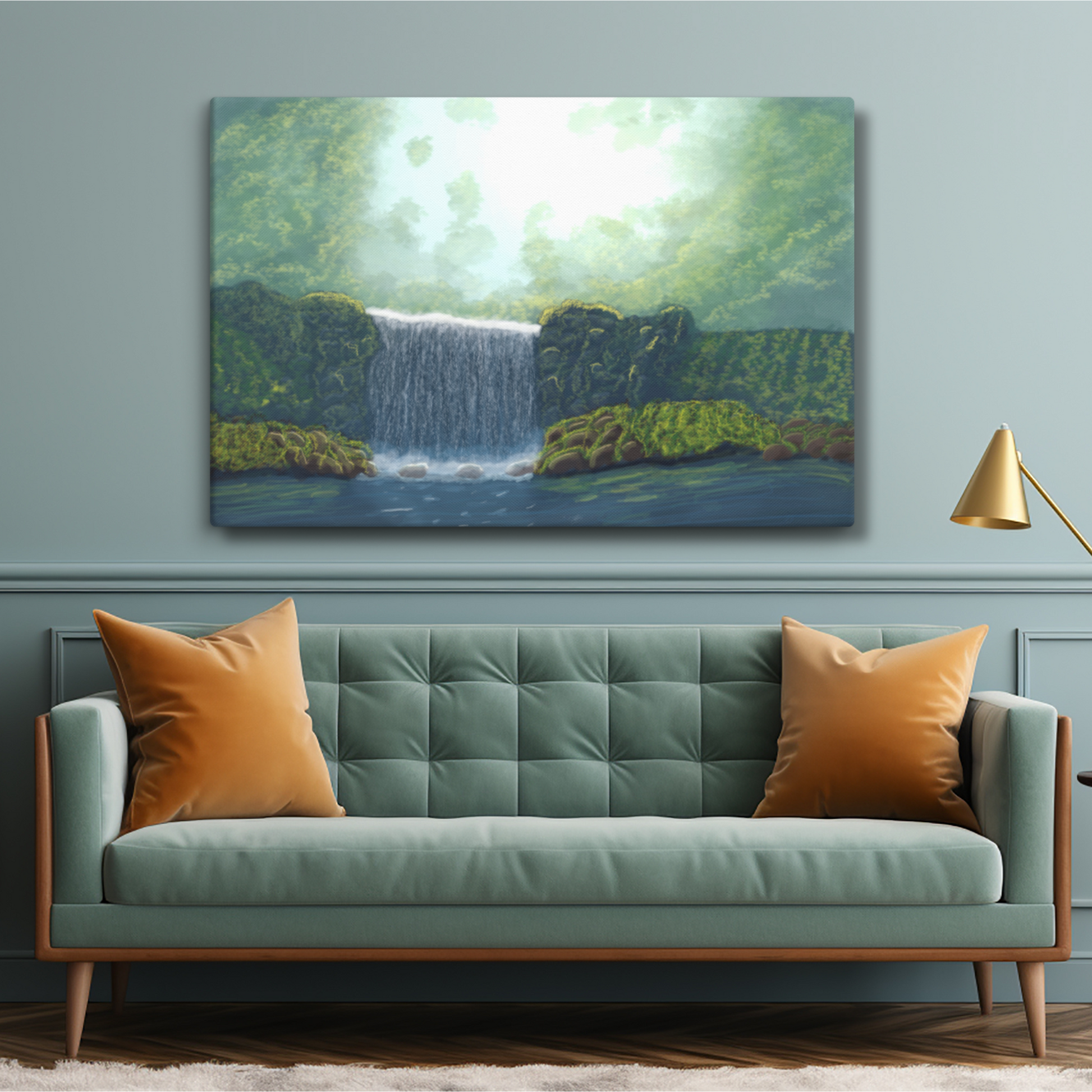 "Secret Waterfall" was digitally hand painted on September 9th, 2024. This painting print is available in an array of sizes ranging from 12"x18"- 40"x60".