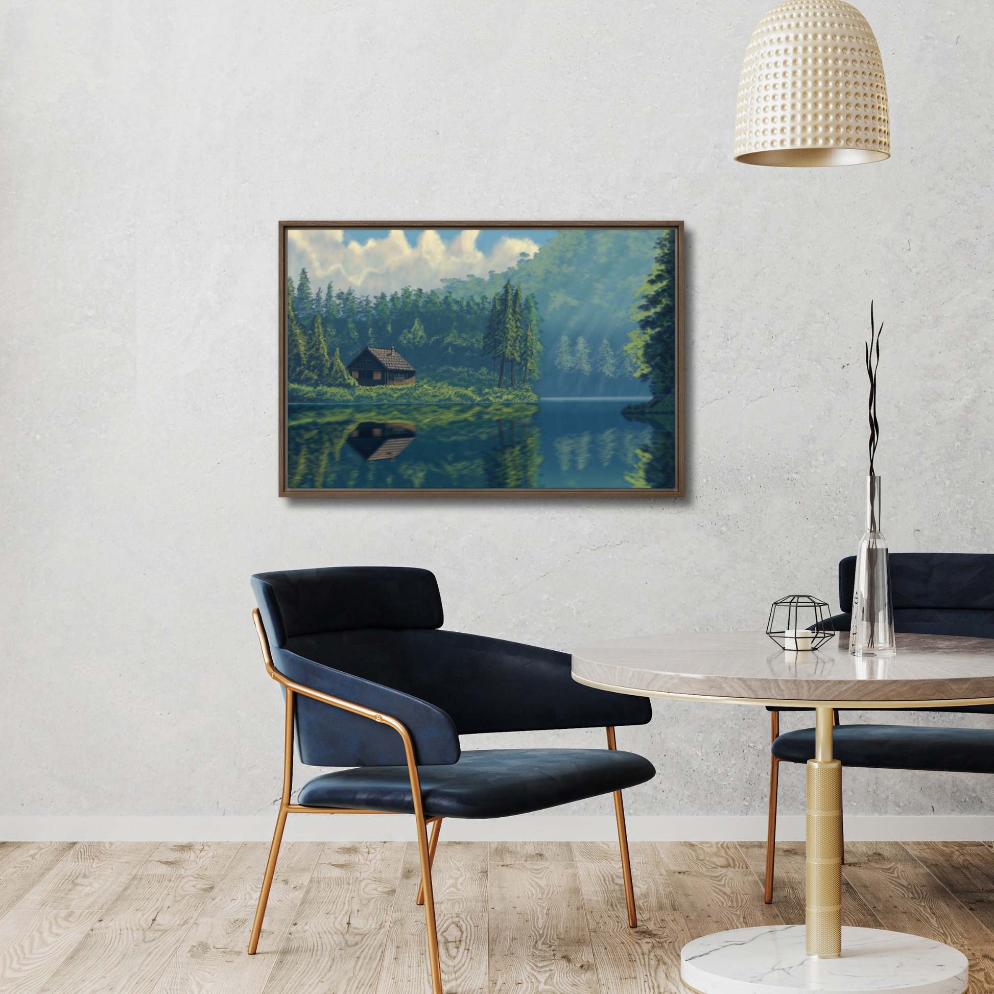 "Cabin On The Lake" Painting Framed Canvas Print