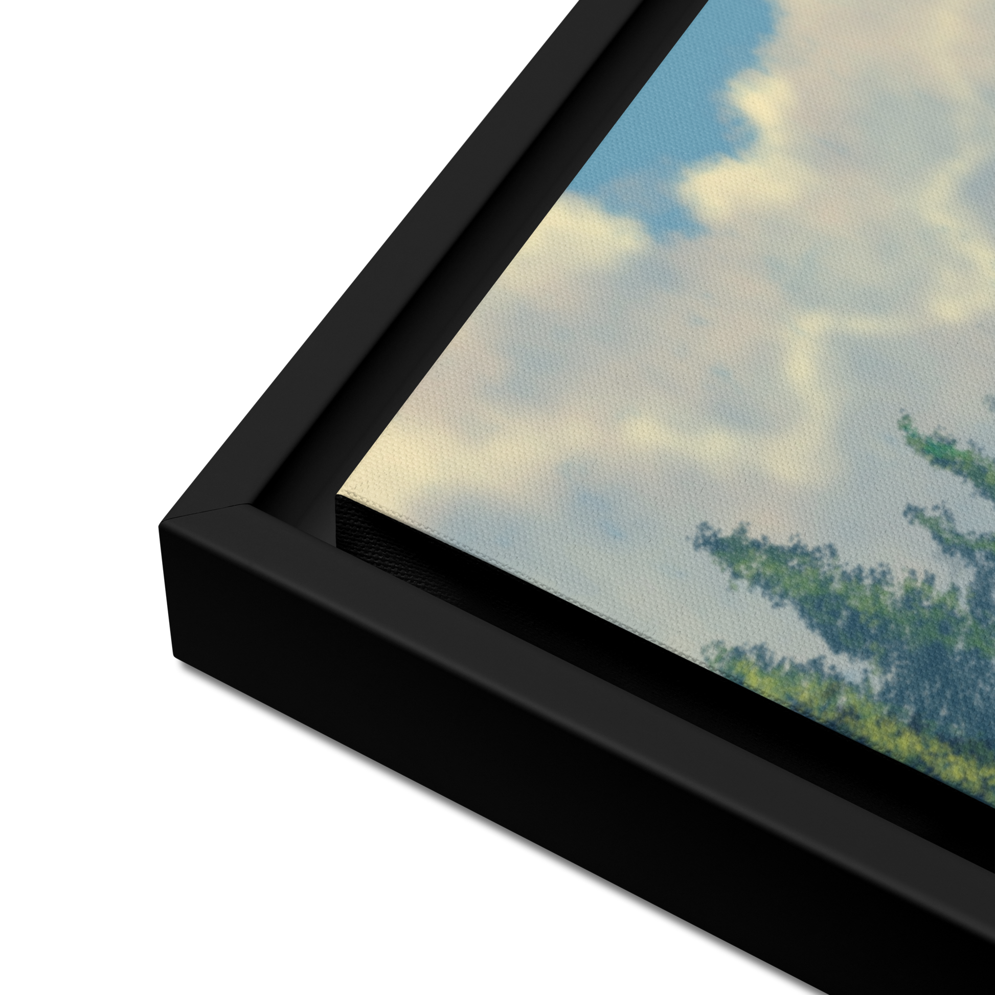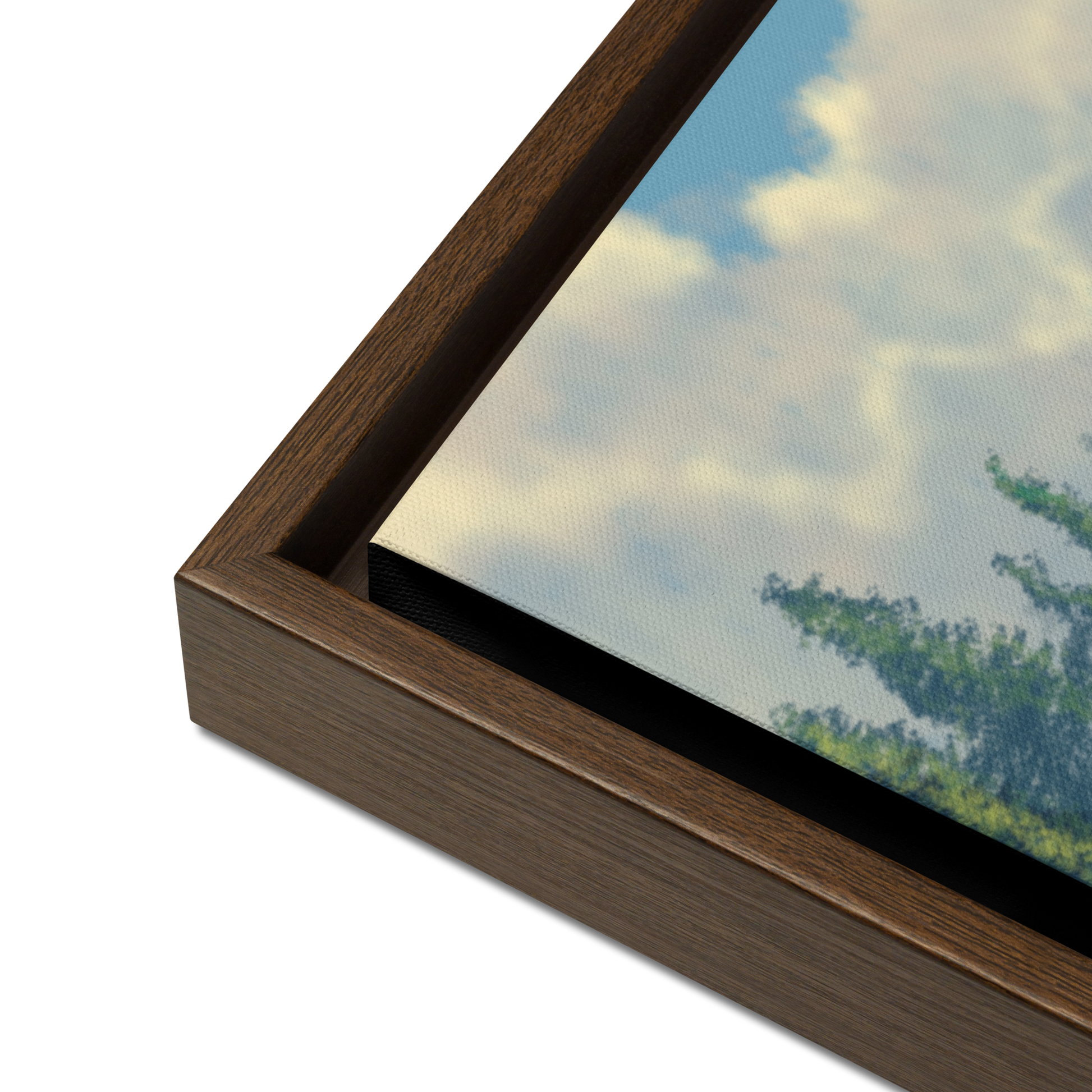 - The framed canvases with brown and black frames have a black inside around the canvas, and the canvases with white frames have a white inside around the canvas.